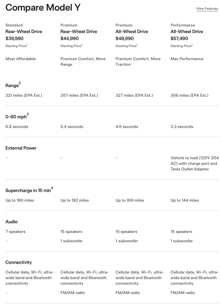 A Tesla szerint a Model Y „standard” 40 000 dollárról, a Model 3 pedig 37 000 dollárról indul, szemben a korábbi 45 000 és 42 500 dolláros „premium” árakkal. Ez csak látszólag kedvező, hiszen a 7 500 dolláros szövetségi kedvezménymegszűnése miatt a végső ár magasabb lett.