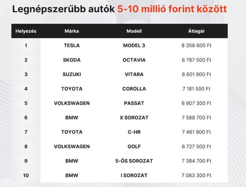 A Tesla mellett továbbra is sokan keresik a Škoda Octaviát, a Suzuki Vitarát és a Toyota Corollát, de a vásárlók egyre gyakrabban választanak fiatalabb, elektromos hajtású járműveket, amelyek jellemzően kevesebb kilométert futottak és korszerűbb technológiát kínálnak.